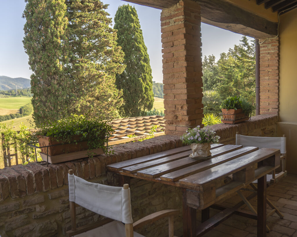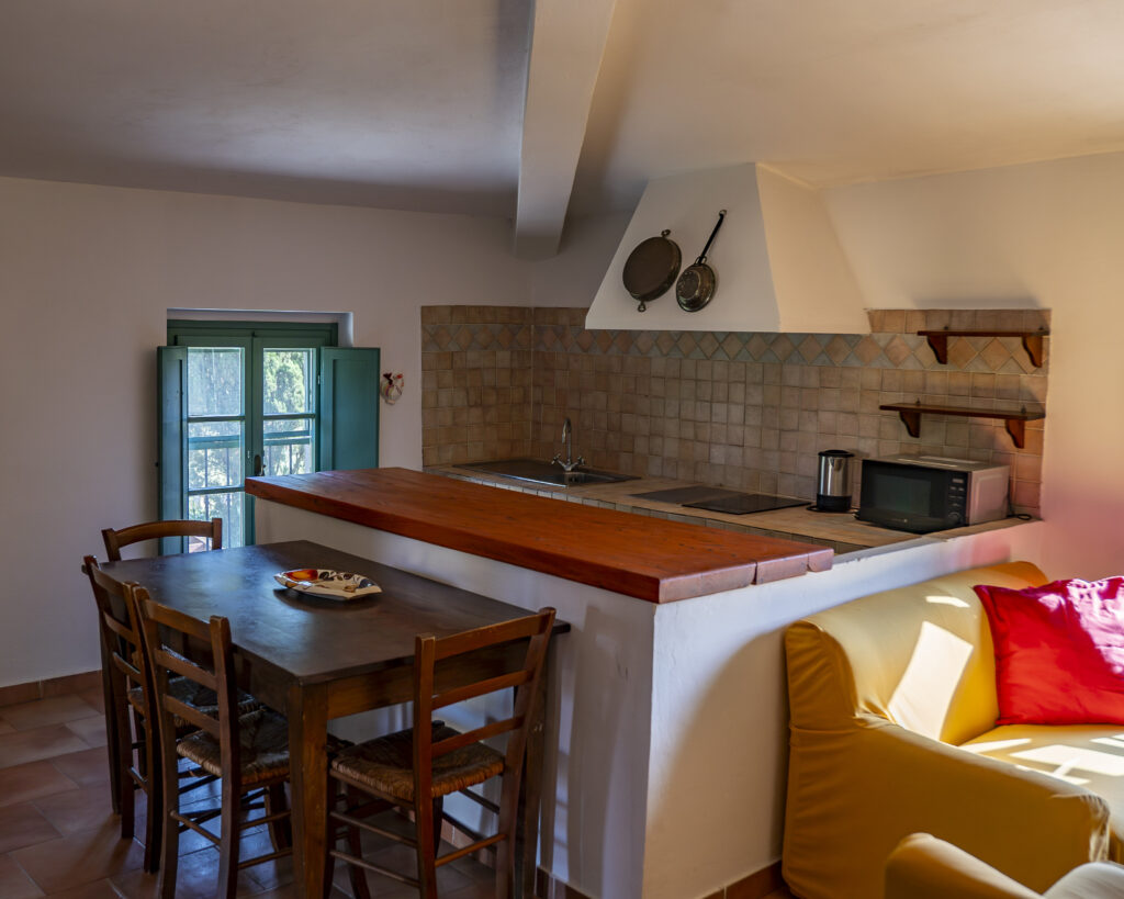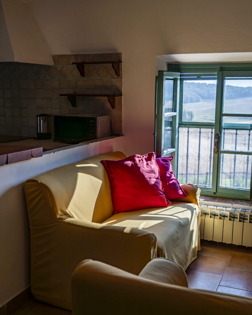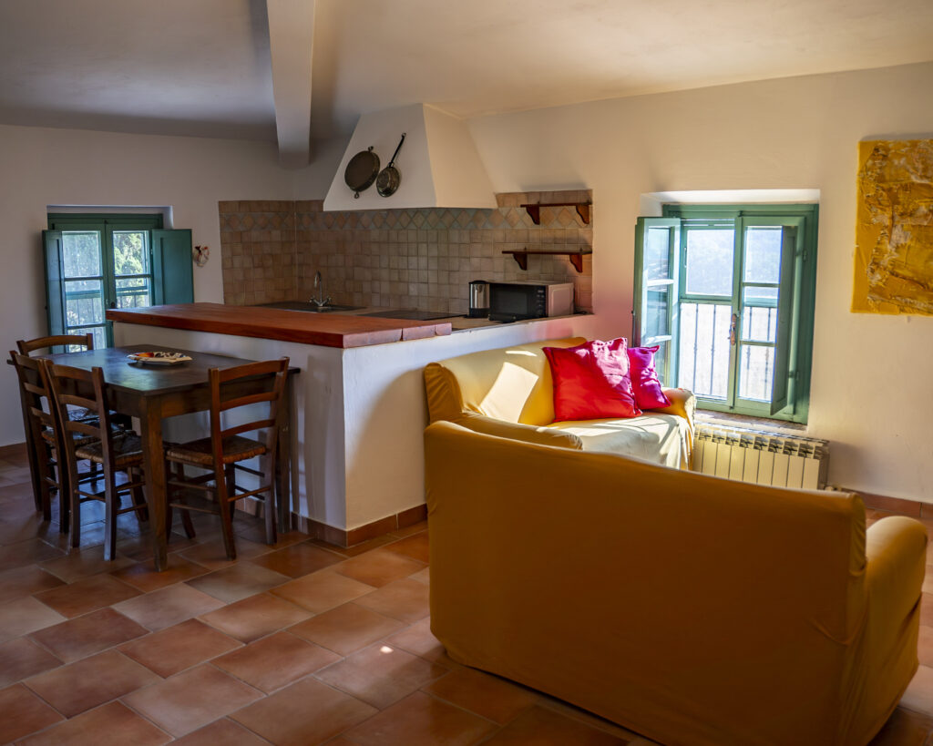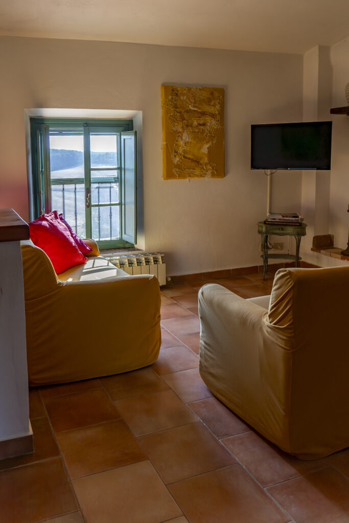 Appartamento con ingresso indipendente posto al 1° piano con ampio terrazzo abitabile dotato di tavolo e sedie per cenare all’aperto. All’interno è organizzato con zona pranzo/soggiorno, angolo cottura in muratura, due divani con vista sul fienile e sui campi di grano. Due camere da letto: una matrimoniale e una con due letti singoli, bagno con doccia.