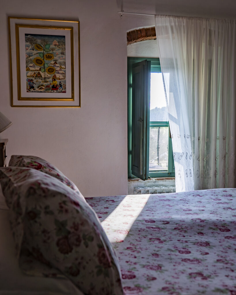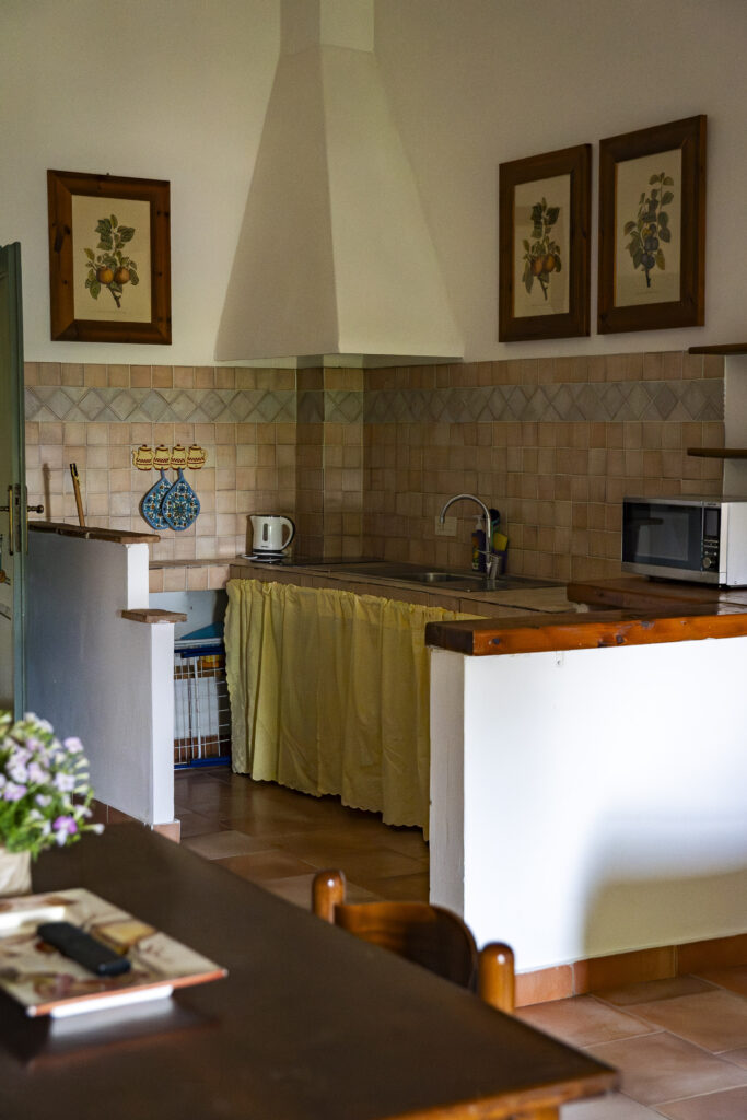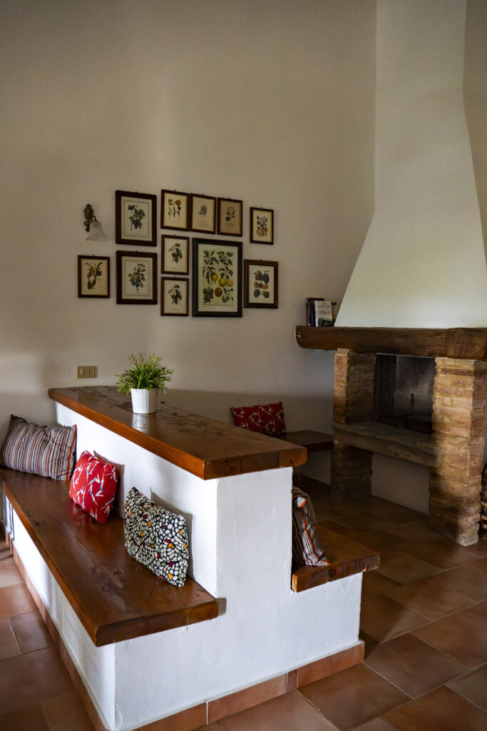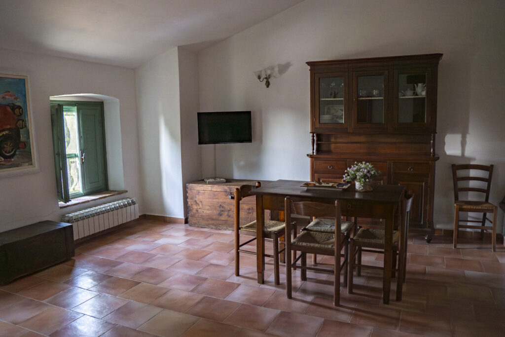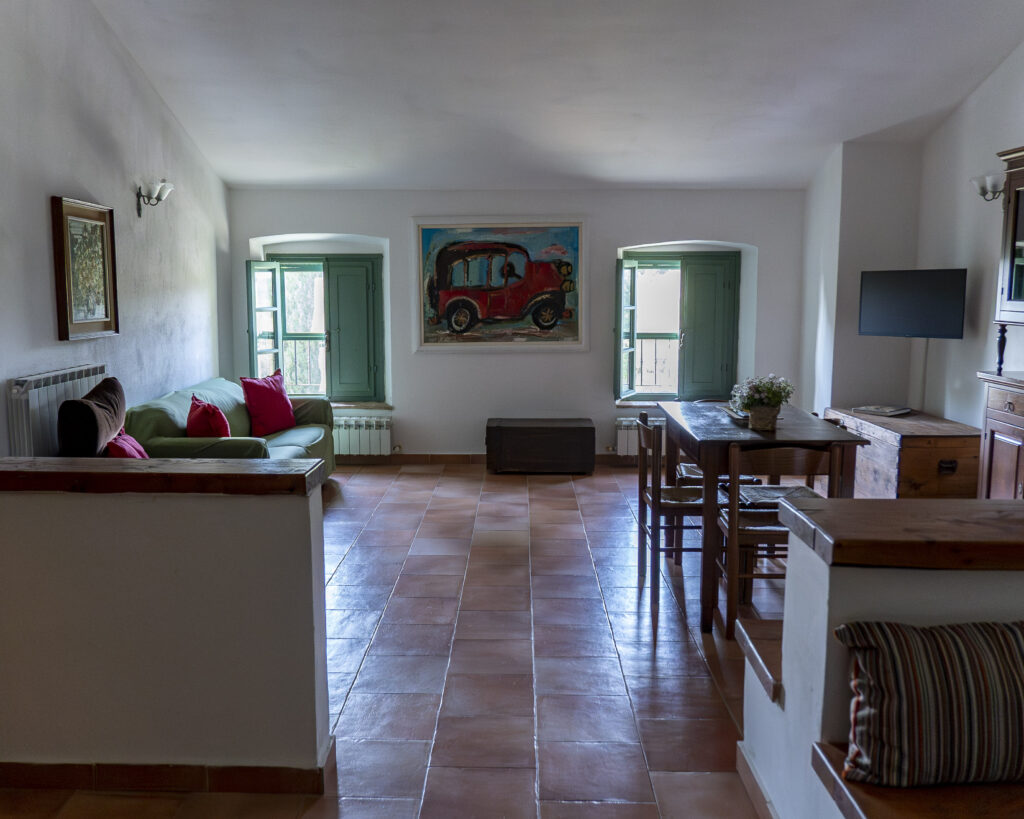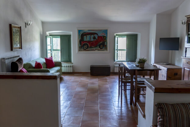 The apartment consists in a large dining / living room with built-in kitchenette, two sofas overlooking the barn and wheat fields.